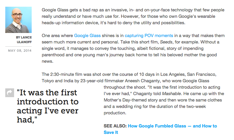 On a shoe string budget we sent our director to India to shoot one son's journey to deliver life changing news to his mom. The video was featured on Google's homepage and received millions of views. The video is no longer on Google's official Youtube page as Google Glass has long been on hold. Our video received lots of press and internet love to show the softer side of Google Glass. I produced the project alongside an Academy Award Winning Producer.